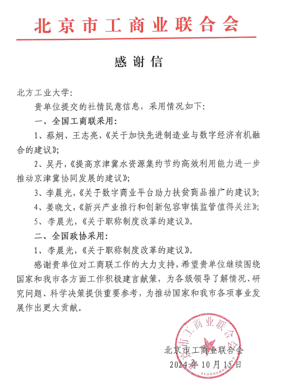 2024年10月16日,北京市工商业联合会发来感谢信,对我校beat365唯一官方网站投稿的“社情民意信息”被全国政协和全国工商联采用的情况进行通报并表示感谢。