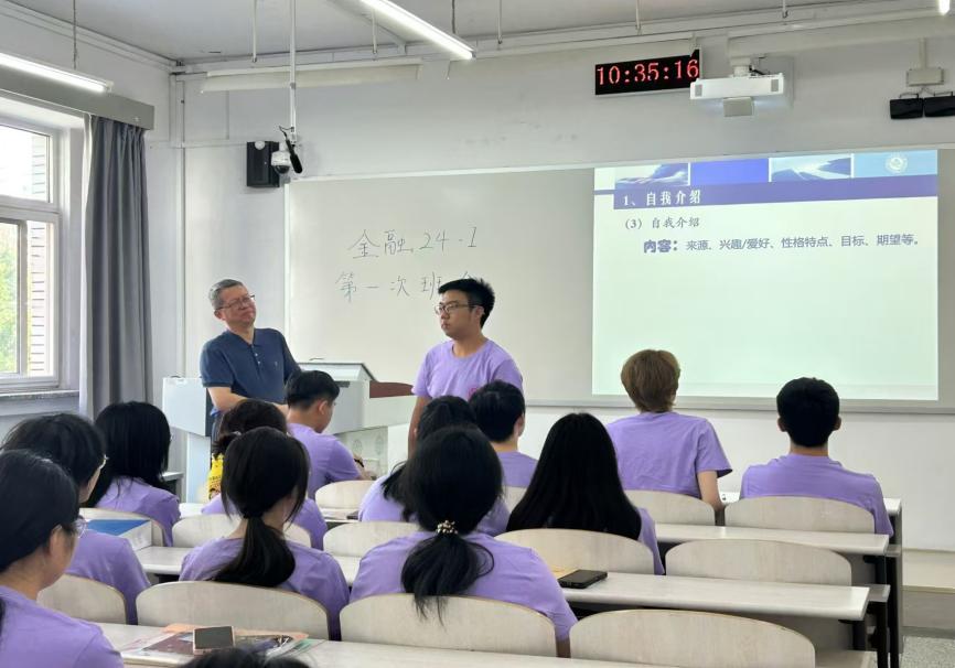 为加强班级建设,提高班级凝聚力,经管学院新生在班导师的带领下召开第一次班会。同学们通过自我介绍进行破冰,班导师对教育教学的整体规划进行介绍,推动新生更好的提高自我认识,加强对未来的思考,未雨绸缪。