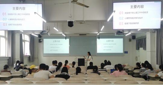 赵姝迪老师从“破冰活动”引入,她指出,心理压力是正常现象,要努力克服学习、生活等方面的焦虑;要尝试自我关怀行动,保持同他人的连结,努力从各种不同情绪中找到其积极意义。并重点介绍了心理委员的职能、心理危机识别和应对等三部分内容。结合具体案例详细讲解了心理委员的工作内容、方法、载体和素质要求,介绍了心理健康教育工作网络体系和心理委员的职责,引导学生骨干充当学校和同学之间的桥梁和纽带,进行沟通、交流和反馈。