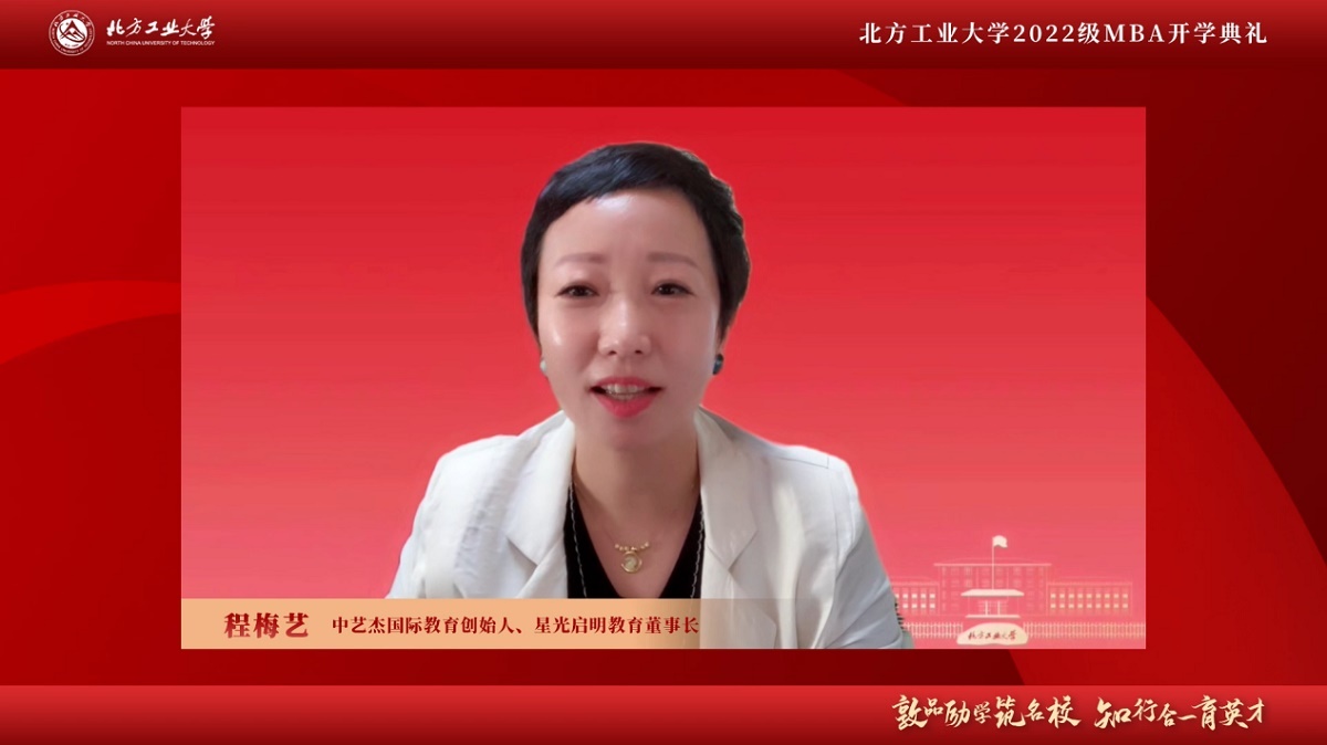 中艺杰国际教育创始人、星光启明教育董事长程梅艺代表校外导师对新加入beat365唯一官方网站MBA的94位新生表示衷心祝贺。她表示,十分期待与大家共学、共创、共享。作为校外导师,她将始终如一地关心和支持学院的学科建设、实务创新和人才培养,尽己所能,与学院同心共进。