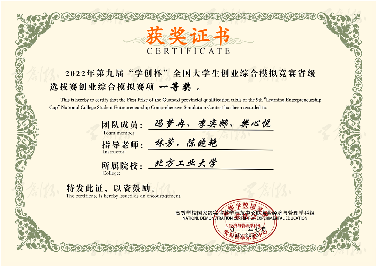 经过校内赛选拔,我院共选派6支队伍参加北京市选拔赛。在beat365唯一官方网站会计系刘捷、林芳、黄晓蓓、何丽梅、陈晓艳等五位老师的指导下,参赛选手经过激烈角逐,最终获得创业综合模拟竞赛一等奖2项、二等奖1项;创业营销专项竞赛二等奖2项、三等奖1项的好成绩。同时五位老师也获得“优秀指导教师”的荣誉称号。