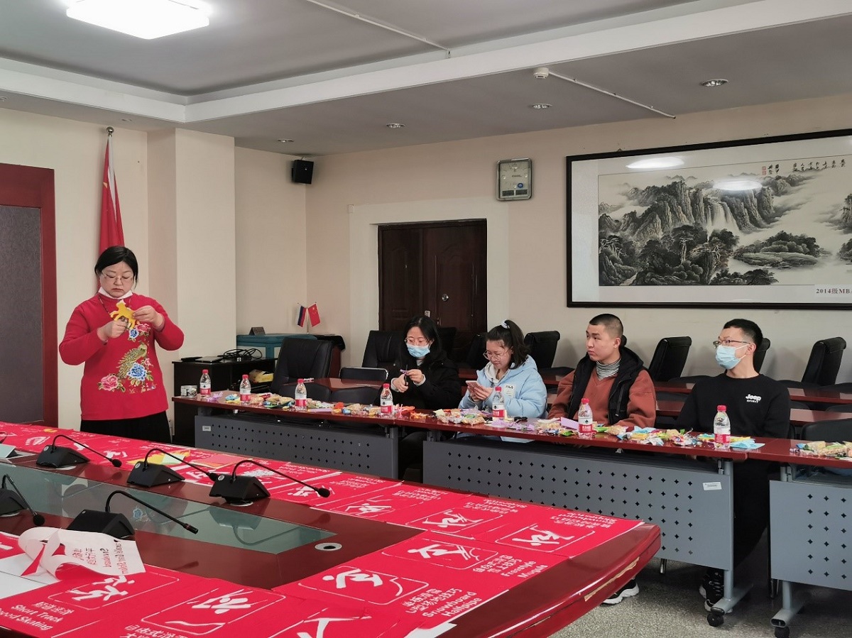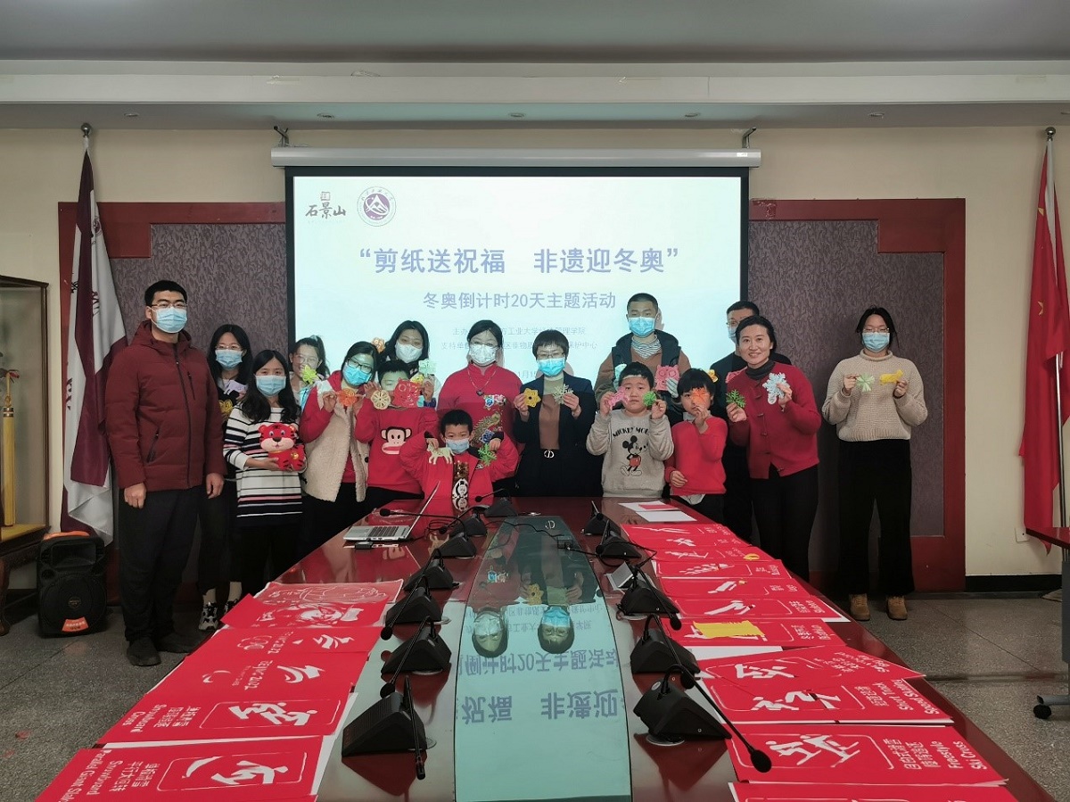 1月15日,在距离2022年北京冬奥会倒计时20天之际,beat365唯一官方网站特举办主题为“剪纸送祝福 非遗迎冬奥”冬奥倒计时20天主题活动暨留校学生迎新春活动,活动得到了石景山区非物质文化遗产保护中心的大力指导与支持。学院党委副书记赵洁、辅导员吴芳、张泽圣以及留校的冬奥志愿者一同参与了此次活动,石景山区剪纸第四代非遗传承人杨秀英老师应邀参加了此次活动。