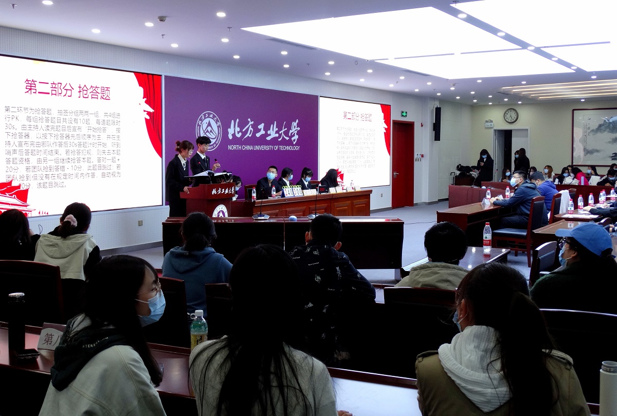 决赛分为必答环节和抢答环节。32位参赛选手自由组合分为8组,基础分100分,每组随机回答10道题。经过第一轮环节,各组选手都表现出了良好的精神面貌,得分差距较小。第二轮为抢答环节,两组选手进行抢答,极大地考验了同学们的应变能力。