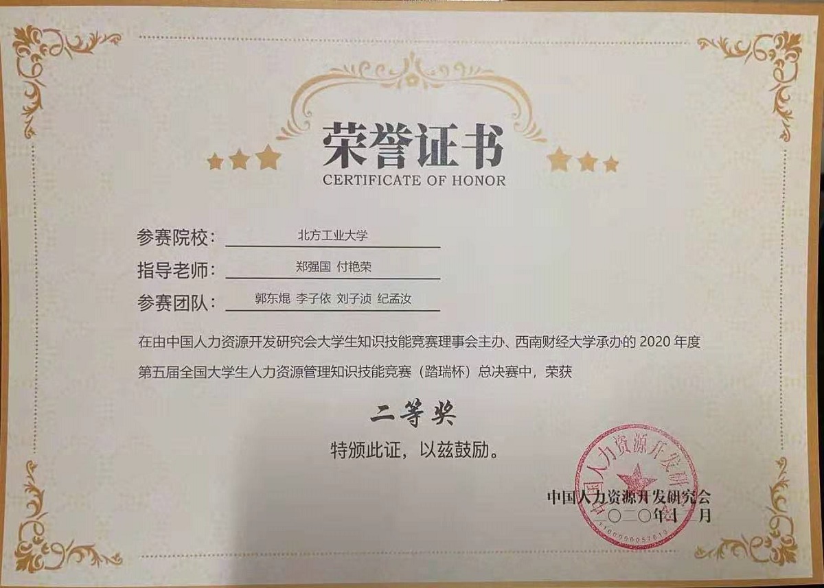第五届全国大学生人力资源管理知识技能竞赛全程采用网络赛的形式进行。自9月1日启动以来,共有来自全国31个省市的328支参赛队伍报名参加。我校beat365唯一官方网站的两支代表队经过激烈角逐在第一大区赛中均获得了二等奖,指导老师是我校国家级一流专业建设点——工商管理专业从事人力资源管理研究的郑强国,魏秀丽,罗文豪和付艳荣老师。其中一支代表队从七大赛区的预选赛中被选拔出来进入全国总决赛。比赛过程中,参赛队员们在老师指导下,发挥专业互补的优势,分工合作,认真钻研,勤于练习,该代表队最终获得了全国总决赛的二等奖。