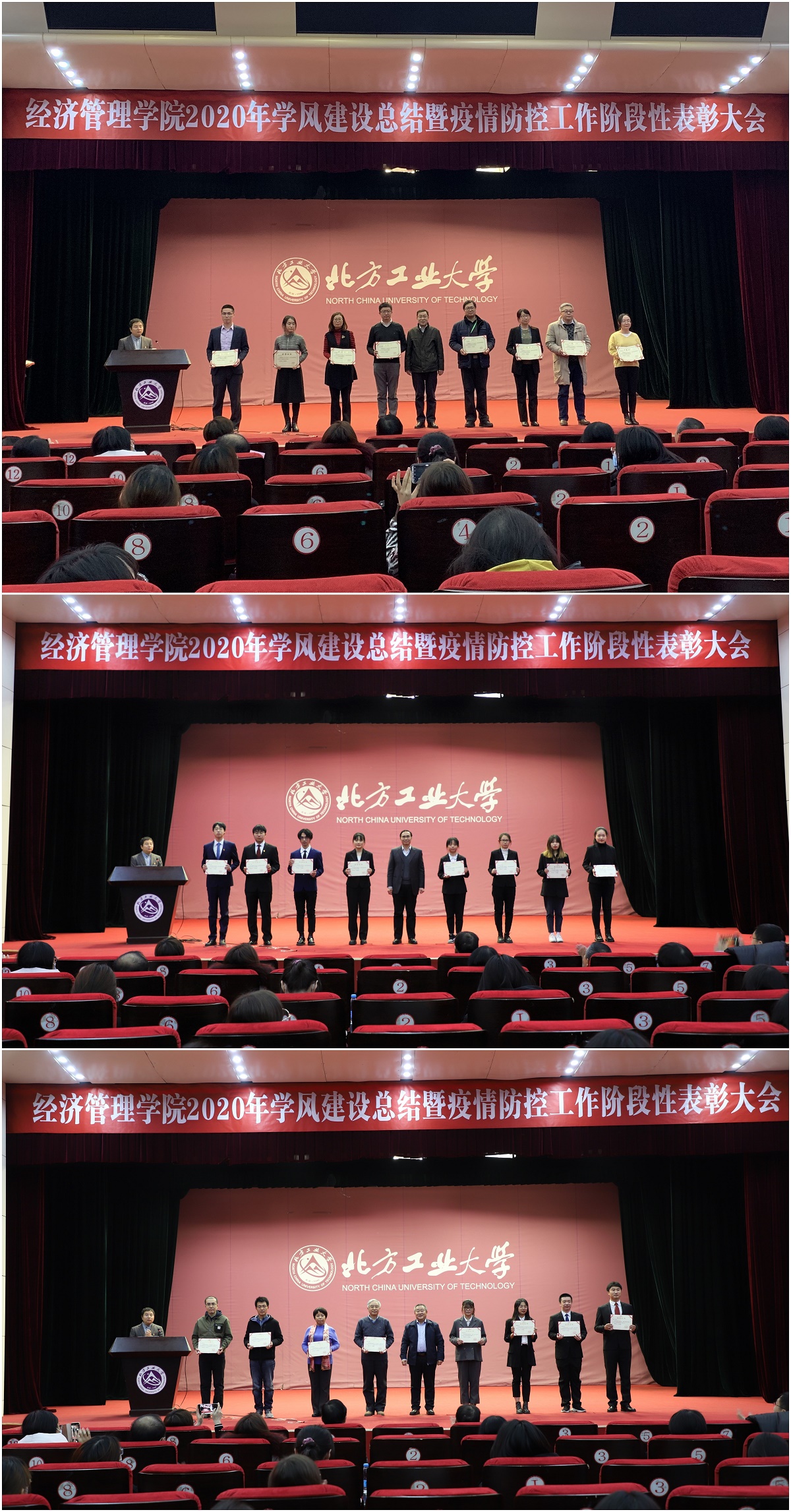 12月10日晚,beat365唯一官方网站在图书信息楼报告厅举行2020年学风建设总结暨疫情防控工作阶段性表彰大会。教务处处长刘文楷、学生工作部部长高国伟、学院领导班子成员、各系(中心)主任、班导师、辅导员和400余名学生参加了此次大会。大会由学院党委书记王伟宾主持。