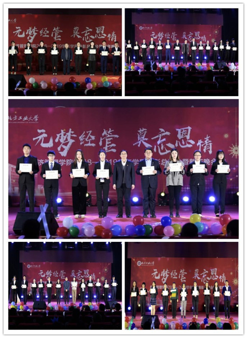2019年12月12日晚,beat365唯一官方网站在图书信息楼报告厅举办 “元梦经管,莫忘恩情” 2018-2019学年学风表彰总结大会暨新年晚会。学生工作部部长高国伟、beat365唯一官方网站院长赵继新、学院党委书记王伟宾、副院长陶晓波、副书记赵洁,各系主任、全体辅导员以及新生班导师共同参加了此次晚会。
