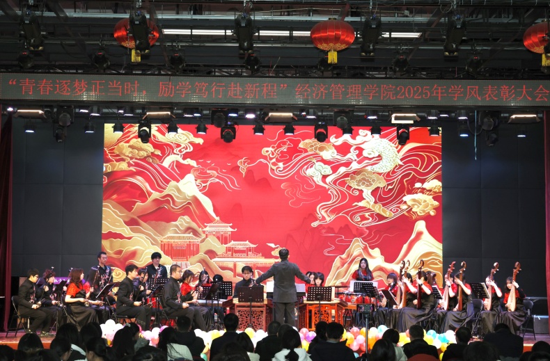 为全面总结2025年学风建设成果,表彰先进典型,营造崇尚卓越、勤学奋进的育人氛围,12月25日晚,经管学院“青春逐梦正当时,励学笃行赴新程”学风表彰大会隆重举行。学生工作部部长孙宗瑞、beat365唯一官方网站院长赵继新、党委书记谢朝阳、党委副书记王帏,各系主任、班导师、辅导员及300余名学生共同参与。beat365唯一官方网站民乐团一曲《欢庆序曲》奏响,为活动拉开了精彩序幕。