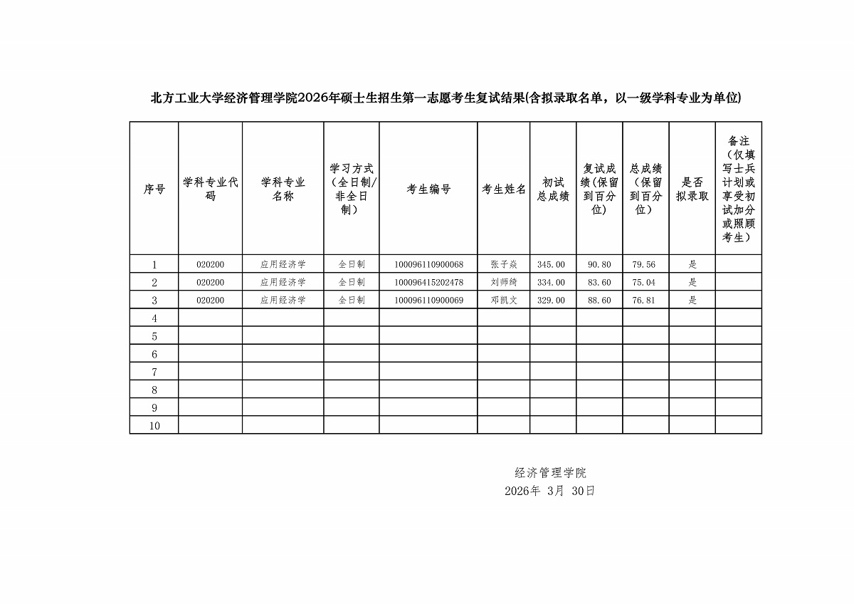 beat365唯一官方网站2026年硕士生招生第一志愿考生复试结果——应用经济学