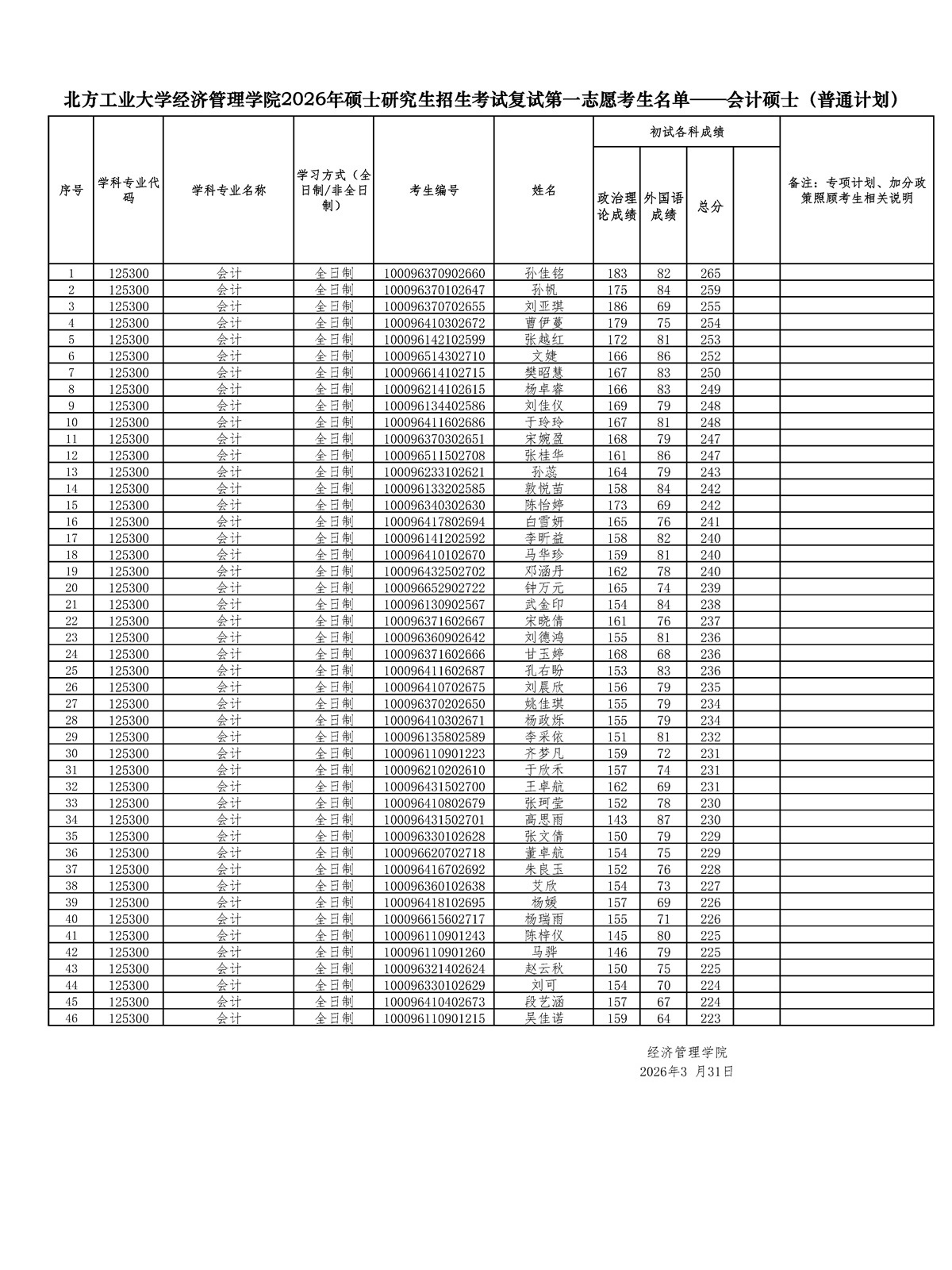 beat365唯一官方网站2026年硕士研究生招生考试复试第一志愿考生名单——会计硕士(普通计划)
