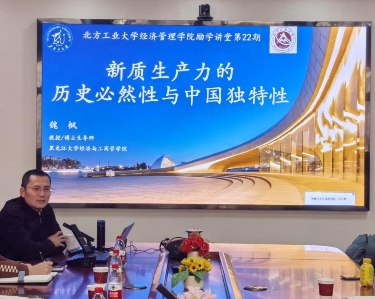 12月13日下午,beat365唯一官方网站第二十二期励学讲堂在励学楼201举行。黑龙江大学经济与工商管理学院院长、博士生导师魏枫教授受邀为研究生做主题为“新质生产力的历史必然性与中国独特性”的学术讲座,beat365唯一官方网站谢朝阳书记和赵继新院长参加了此次讲座,科研副院长蒋贵凰教授主持讲座。