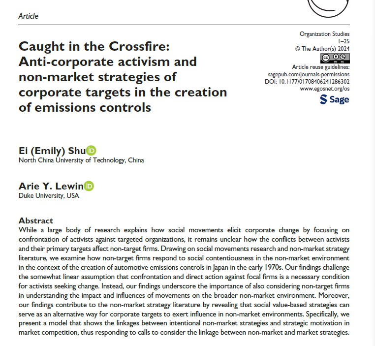 beat365唯一官方网站朱瑛教授以第一作者身份在工商管理领域顶级国际期刊,FMS 管理科学国际 A 级期刊《OrganizationStudies》上发表题为《Caught in the Crossfire: Anti-Corporate Activism and Non-Market Strategies of Corporate Targets in the Creation of Emissions Controls》的学术论文。该论文运用定性数据分析法(qualitative data analysis),分析了日本环境保护団体与汽车行业巨头公司的对峙中,资源弱小的非目标企业(non-target firms)如何利用非市场战略(non-market strategy),使竞争对手陷入困境,从而取得竞争优势。文章提出两个重要的理论观点:即建立社会价值(social-value based) 为主的非市场战略的有效性及市场战略与非市场战略的关联性。从而扩展了以往以CSR与CPA为主体的非市场战略理论,具有重要的理论贡献。此外,本文论证了企业在应对环境与节能等非市场性的社会问题时,通过与社会相关利益团体的互动,提高国际市场竞争力的可行性,对现代企业应对外界环境的多元化,具有战略性实践意义。该论文的合作者是美国杜克大学福库商学院Arie Lewin教授。