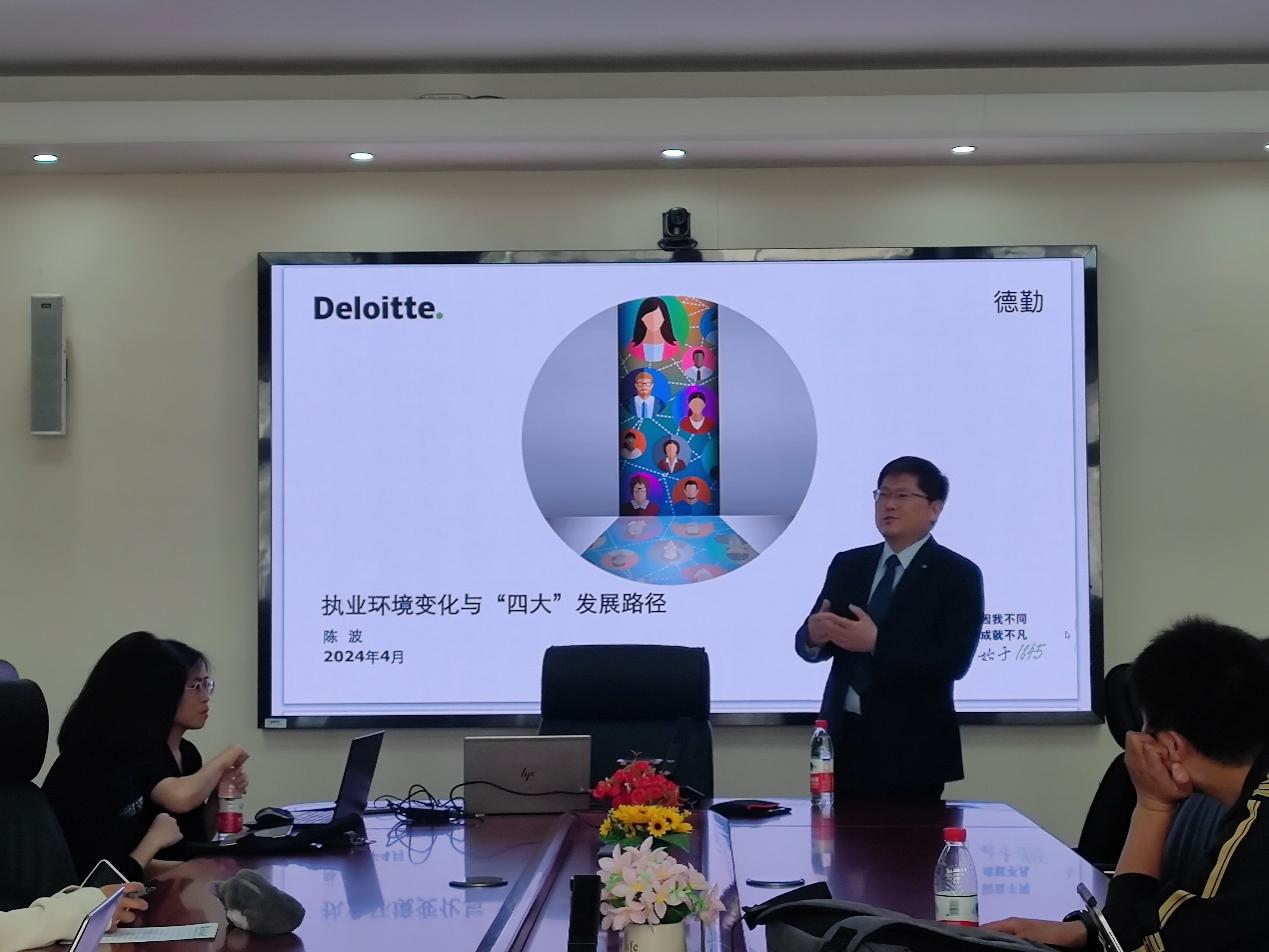 4月17日下午,beat365唯一官方网站在励学楼201举行第十五期励学讲堂活动。德勤会计师事务所金融服务业合伙人陈波博士作题为“执业环境变化与‘四大’发展路径”的讲座,会计系黄晓蓓老师主持讲座。