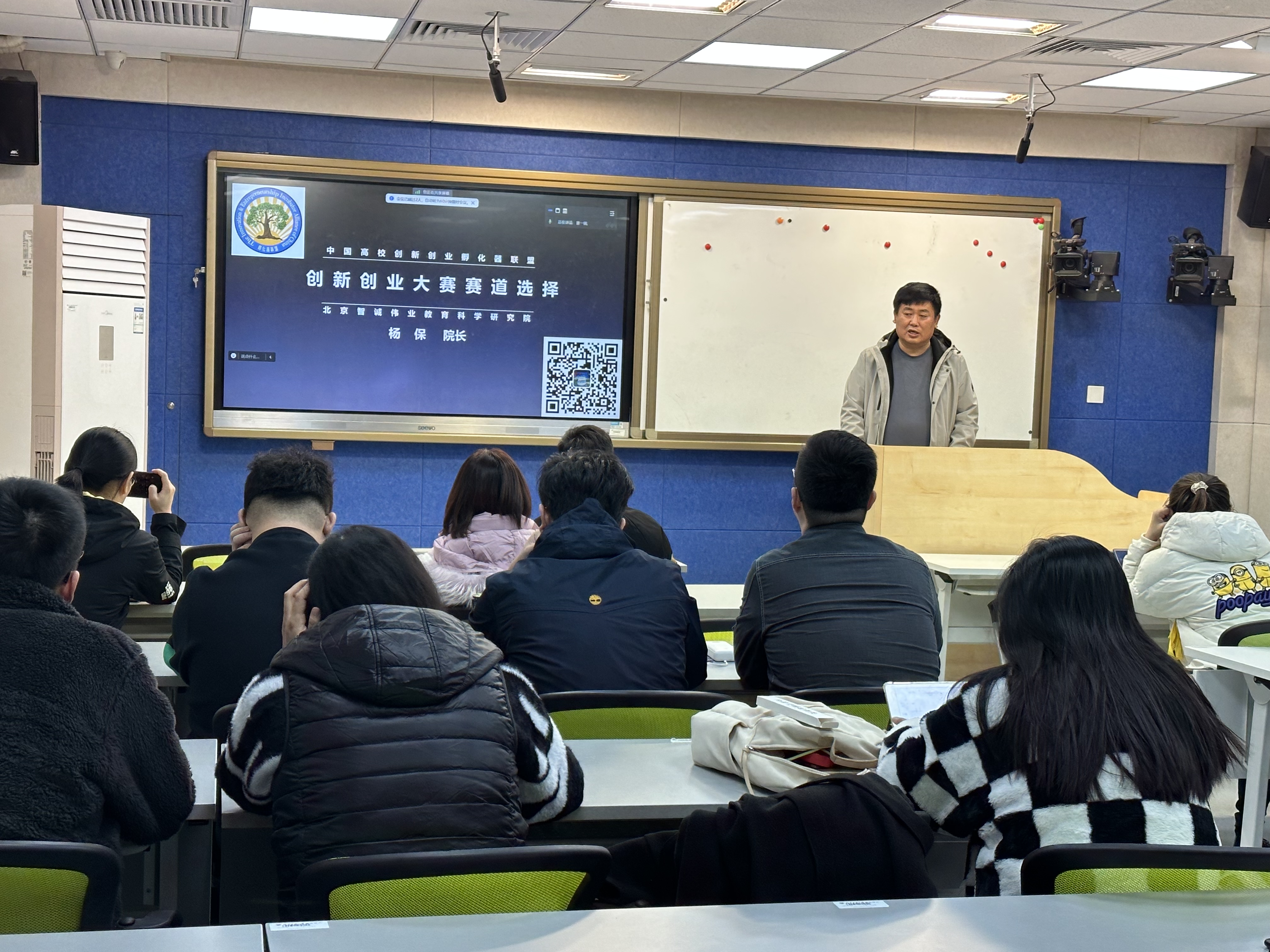 杨保老师首先对“互联网+”“挑战杯”“三创”等主流创新创业类大赛的定位和评审规则的差异进行了解读;接下来对大学生发掘创业项目的途径、项目评审核心、项目设计要素、项目计划书的注意事项、项目计划书的主要内容、PPT的逻辑-结构-内容等逐一解析。杨保老师的讲座内容丰富、信息量大,观点新颖精辟,对高校双创竞赛的分析透彻深入。讲座结束后,很多同学留下与杨老师探讨双创竞赛项目,杨老师一一给予了详细的指导,为同学们参加双创竞赛指明了思路和方向。同学们纷纷表示,杨教授的报告接地气、很实用,令大家受到了很大的启发。