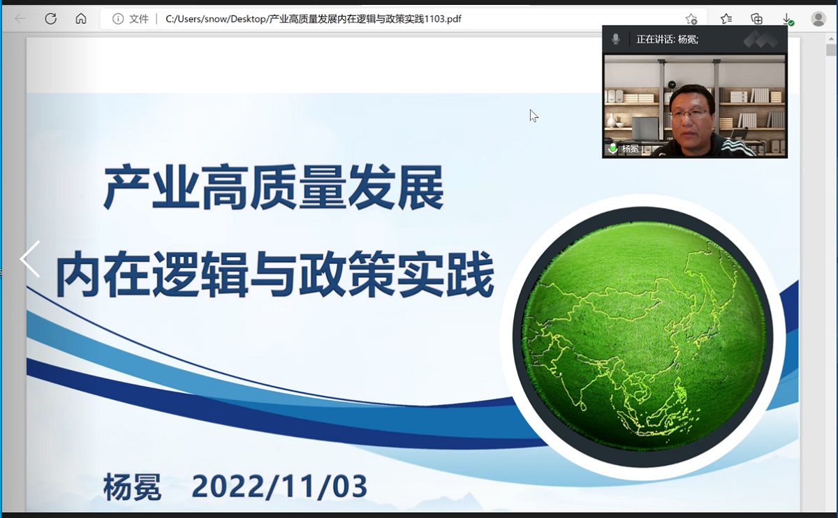 首先,杨冕教授重点阐述高质量发展的由来及其本质内涵;随后,杨教授通过丰富理论知识,向与会师生深刻的阐述了产业高质量发展的核心内涵及测度指标体系的理论逻辑,帮助师生更好地把握产业高质量发展的科学内涵及基本要义;最后,杨教授遵循“国家层面—省级层面—市级层面”三个维度,梳理归纳并总结现阶段国家与区域层面产业高质量发展的重点工作和政策体系。