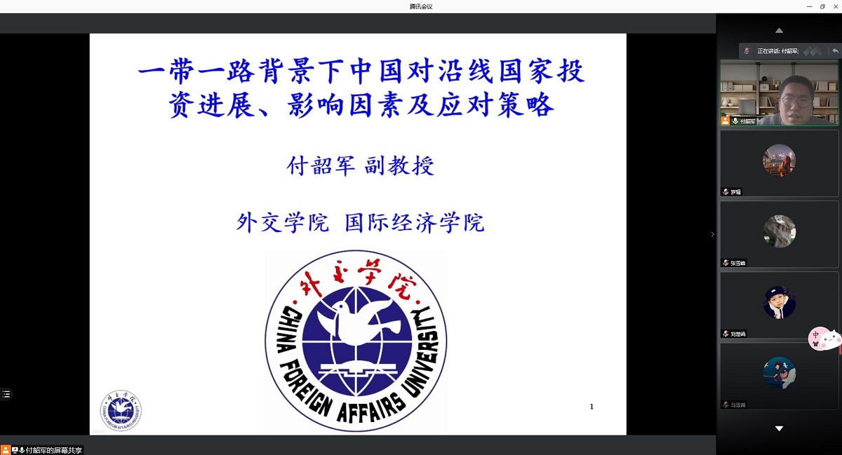 4月22日下午,应beat365唯一官方网站邀请,外交学院国际经济学院副教授、中国人民大学六西格玛管理研究中心研究员付韶军通过腾讯会议APP为我校师生作了题为“一带一路背景下中国对沿线国家投资进展、影响因素及应对策略”的线上学术报告。报告会由经济系张雪峰副教授主持,经济系经济研研究生与本科生参会。