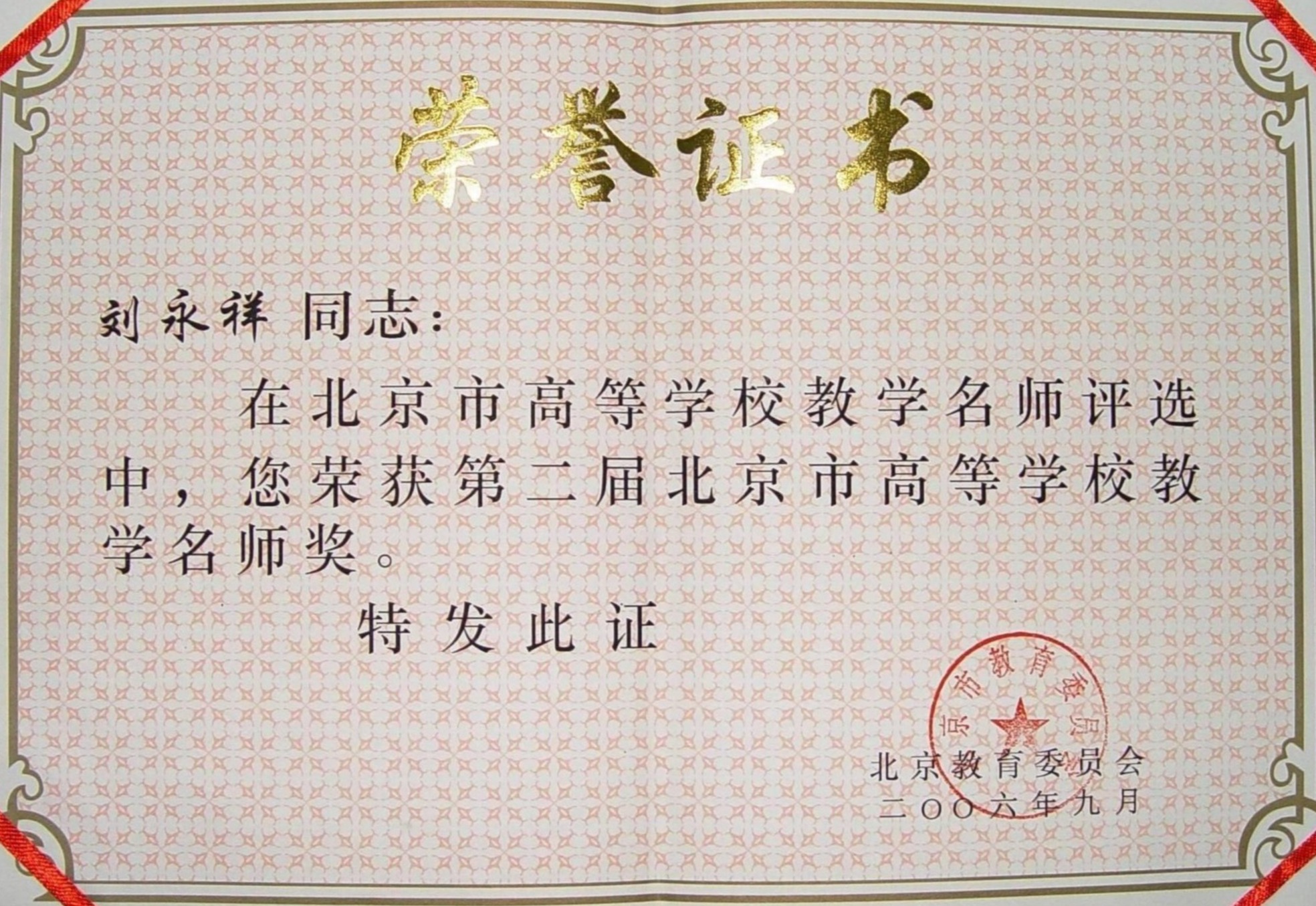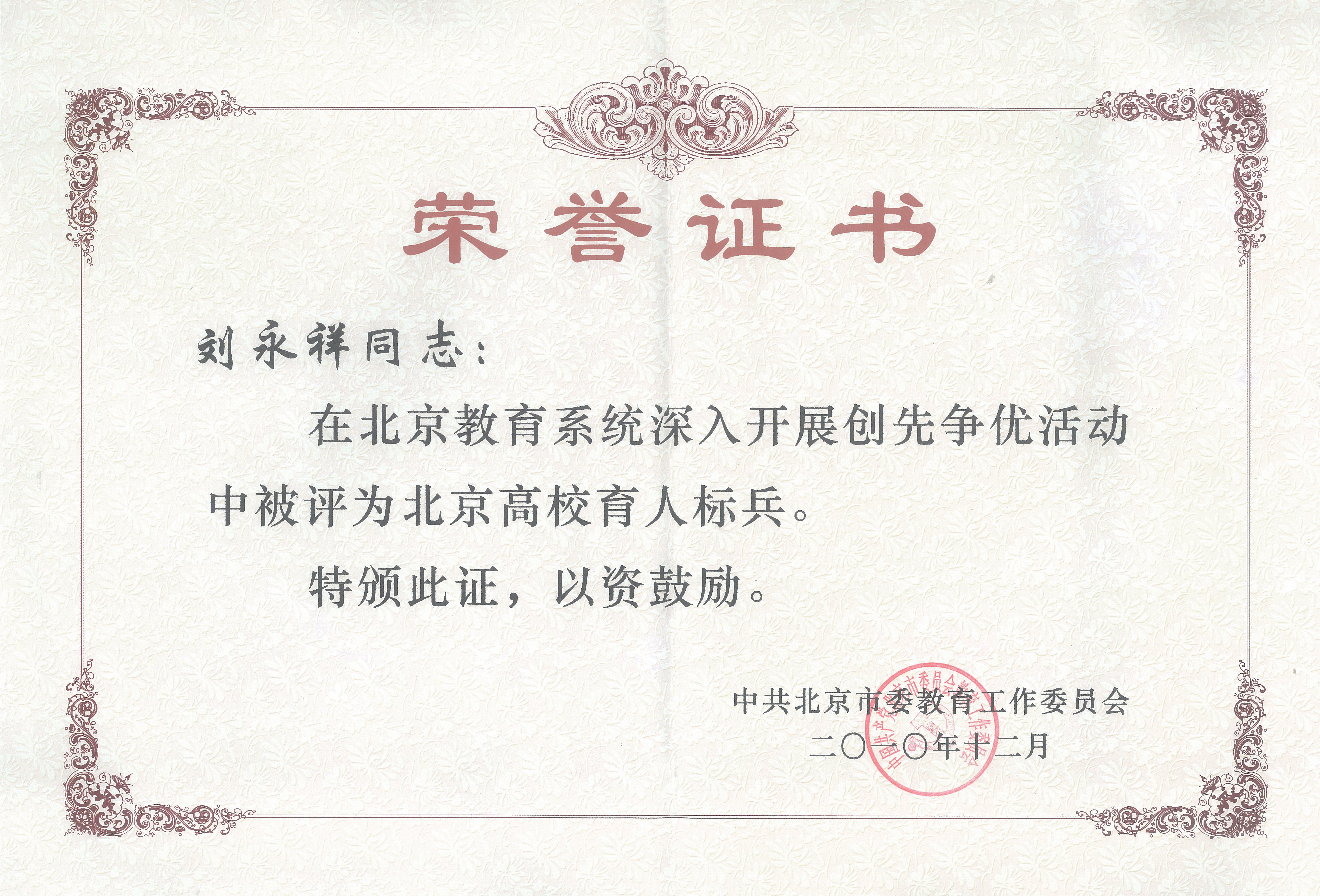 刘永祥 北京高校育人标兵称号 |