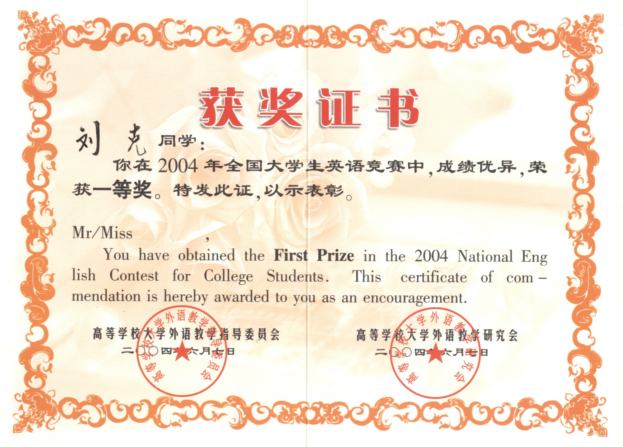 全国英语竞赛一等奖 |