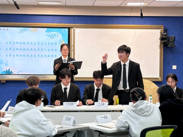 活动共12支队伍参赛,6支队伍晋级复赛。各队伍围绕辩题展开了激烈的探讨。赛场上,同学们据理力争、妙语连珠,展现了敏捷的思辩能力和优秀的表达能力。最后,3支队伍成功晋级决赛,围绕“大学生职业规划更应注重自身技能/个人目标/就业前景”展开了激烈讨论。三方各执不同观点,从不同方向、不同切入点进行论辩。