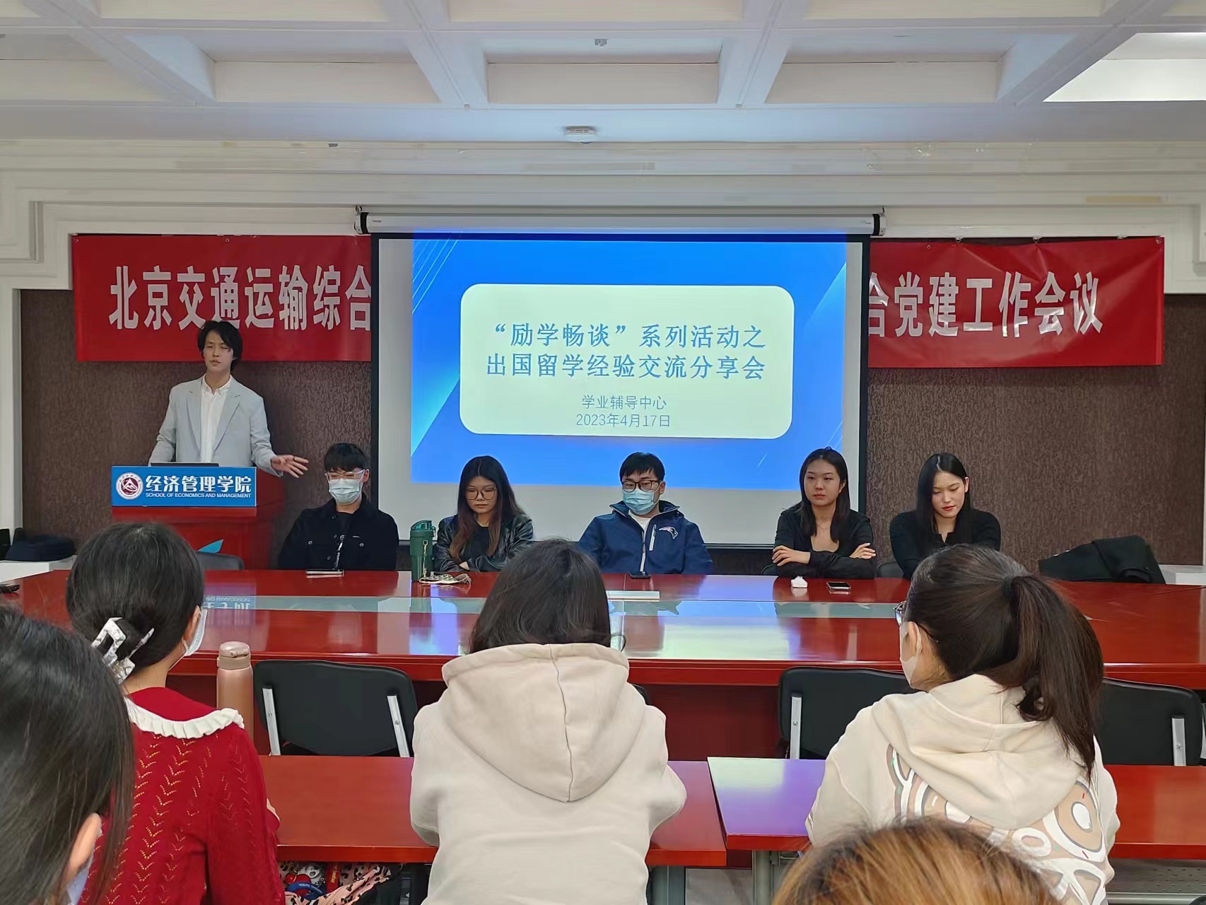 会上,6位获得国外大学offer的学长学姐依次进行了经验分享交流。他们结合自身经历,围绕日常学习、外语提升、前期申报准备、国外学校选择、简历制作等方面内容,深入细致与同学们进行交流分享,既分享了获得出国留学offer的过程,也讲述了自己的心路历程,并解答了同学们提出的问题。