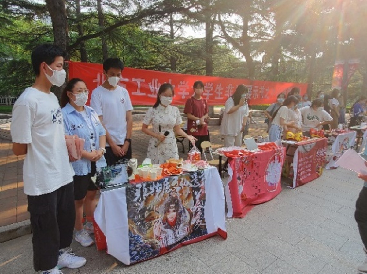 随后, “大学生非遗展示节”揭幕,来自五湖四海不同民族的同学们分别介绍家乡非遗。现场还展示了石景山区的非遗项目以及非遗文创产品,吸引了学校在校同学积极参与。