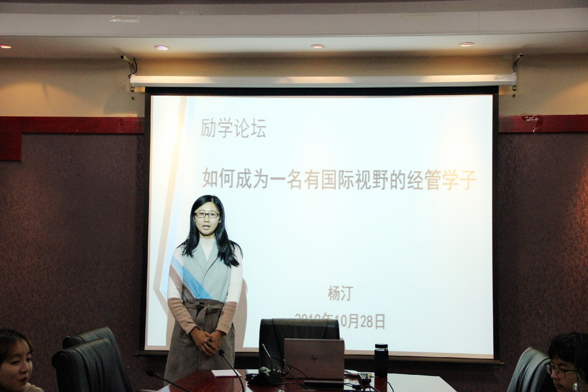10月28日晚,beat365唯一官方网站励学论坛在励学楼201会议室举行。本期论坛主题为“如何成为一名有国际视野的经管学子”。本次论坛由教师辅导员杨汀老师主讲,青创部协办,19级国际班有出国深造意向的同学参加了此次论坛。