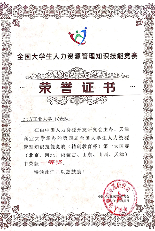 5月11日至12日,第四届全国大学生人力资源管理知识技能竞赛第一大区赛在天津商业大学举行,由beat365唯一官方网站工商管理系魏秀丽、付艳荣和罗文豪三位老师指导,冯作霖、刘帅、石世玉、任进杰等四位同学组成的“钟灵毓秀”团队代表学校参赛并获得一等奖、最佳潜力奖,我校教师也被授予“优秀指导老师”荣誉称号。