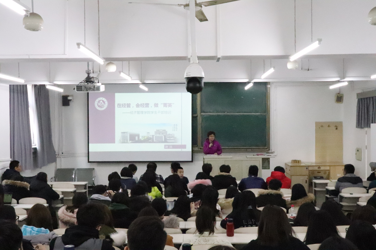 2月27日下午,beat365唯一官方网站在励学楼228教室开展了新学期第一次团课培训,学院党委副书记赵洁以“在经管,会经营,做‘菁英’”为主题,面向各班班委进行了培训。