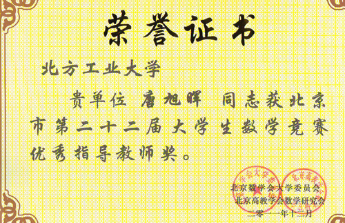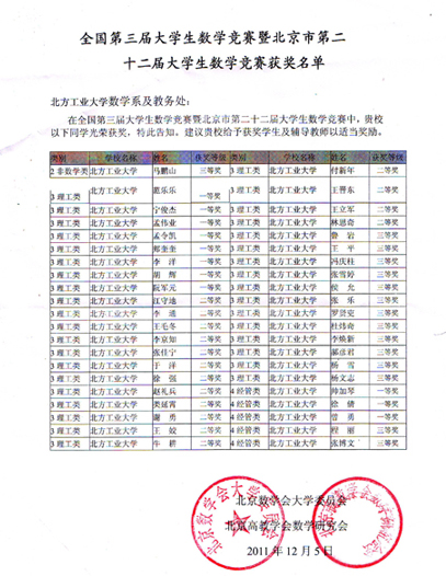 近日,全国第三届大学生数学竞赛暨北京市第二十二届大学生数学竞赛颁奖会在北京邮电大学举行,我校共有42名学生获奖,获奖人数仅次于北京大学、北京邮电大学、北京航空航天大学、北京科技大学,位居第五位。同时,我校还获得优秀组织奖,唐旭晖老师获得优秀指导教师奖。