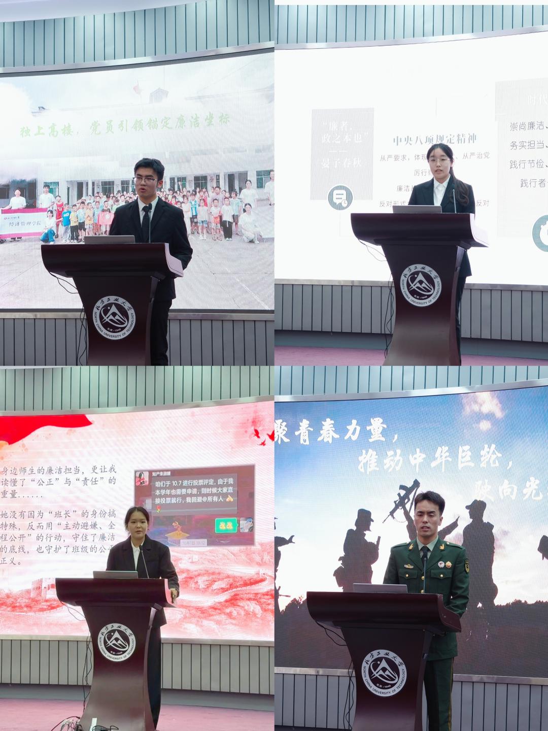 决赛现场,9位参赛选手结合自身感悟、校园生活与社会实例,从校园廉洁风气倡导到社会清风正气期盼,从个人修身立德思考到青年担当使命践行,用饱满的热情、真挚的情感和生动的语言,多角度诠释对廉洁自律的深刻理解,展现新时代青年践行廉洁理念的坚定决心。选手们的演讲既有思想深度,又具感染力,为在场师生带来了一场深刻的精神洗礼与思想启迪,现场掌声此起彼伏。