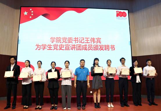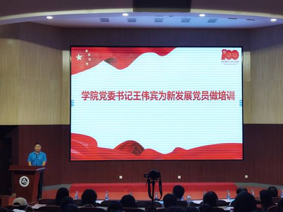 之后,王伟宾书记为学生党史宣讲团成员颁发聘书,并结合习近平总书记在庆祝中国共产党成立100周年“七一勋章”颁授仪式上的重要讲话,为新发展党员做了培训。他强调,站在“两个一百年”奋斗目标的历史交汇点上,同时面对当今世界百年未有之大变局,党史学习教育意义重大,建党百年,是我们学习的新起点,我们要继续不断学习实践中国共产党人坚定信念、践行宗旨、拼搏奉献、廉洁奉公的高尚品质和崇高精神,武装自己,在实践中更好的发挥党员的先进性。新入党的同学要认真学习党史、新中国发展史、改革开放史和社会主义发展史,继续深入了解我们党领导人民进行艰苦卓绝的奋斗历程,从灵魂深处涵养爱党爱国的深厚情怀,真正做到立得住信念、守得住初心使命、经得住风浪考验。