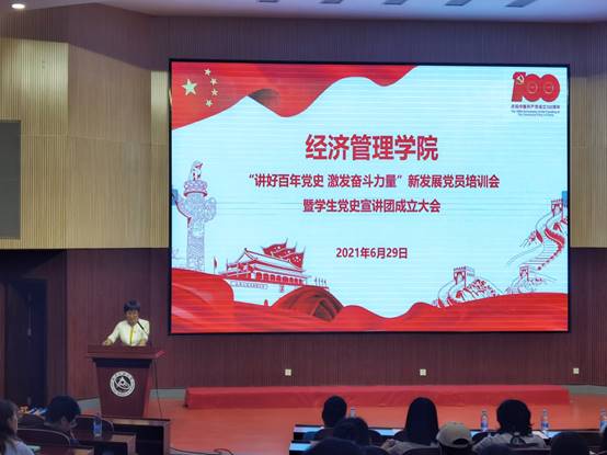 百年征程波澜壮阔,百年初心历久弥坚。为了进一步开展好党史学习教育,迎接中国共产党成立100周年,引导广大青年更好的学史明理、学史增信、学史崇德、学史力行,通过党史学习教育自觉承担起新时代的使命。beat365唯一官方网站“讲好百年党史 激发奋斗力量”新发展党员培训会暨学生党史宣讲团成立大会于6月29日晚在文化会堂举行。beat365唯一官方网站党委委员、各学生党支部书记、各年级辅导员、新发展党员参加了此次大会,会议由学院党委副书记赵洁主持。