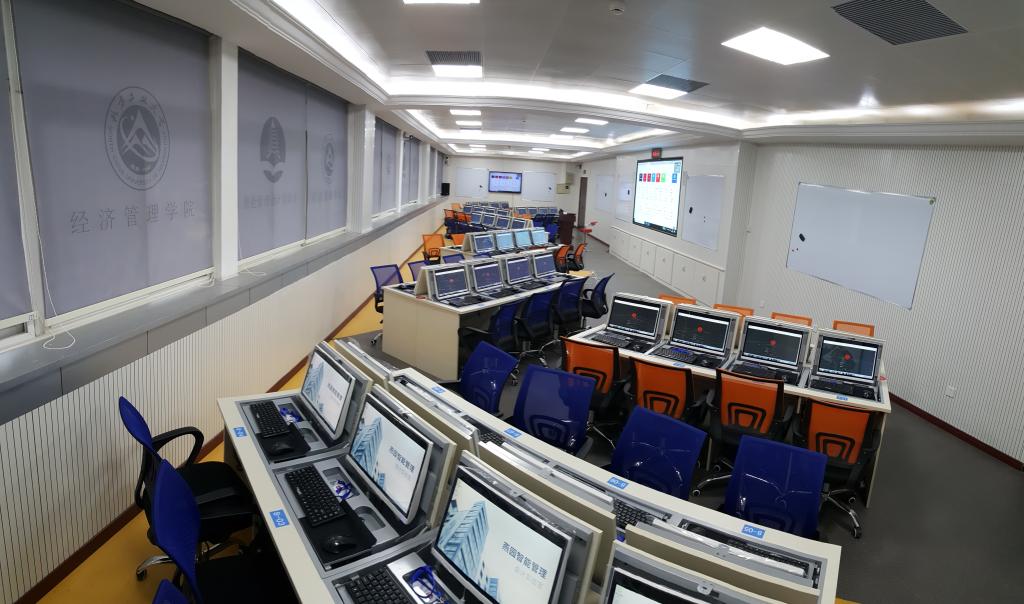 实验中心软硬件条件现代化程度高,设备设施较为完备,各类实验室占地面积1320m2,固定资产总值1800余万元。目前建有案例研讨室、虚拟演录播智慧教室、3D虚拟电子商务实训室、智能管理会计实验室、虚拟办公实训室、保险科技实验室、商业智能决策实验室等20个实验室,教育网和联通专线双千兆宽带网络接入,10余台服务器,300余台电脑。同时,已采购经管类国内主流软件模拟实训平台,服务于各类经管实验课程、专业竞赛和其他教学科研活动,并每天向学生免费开放。